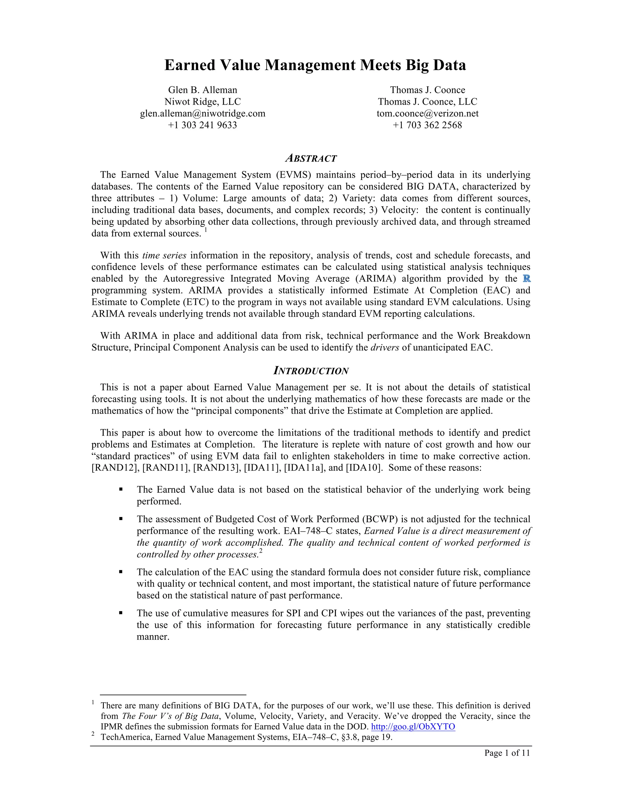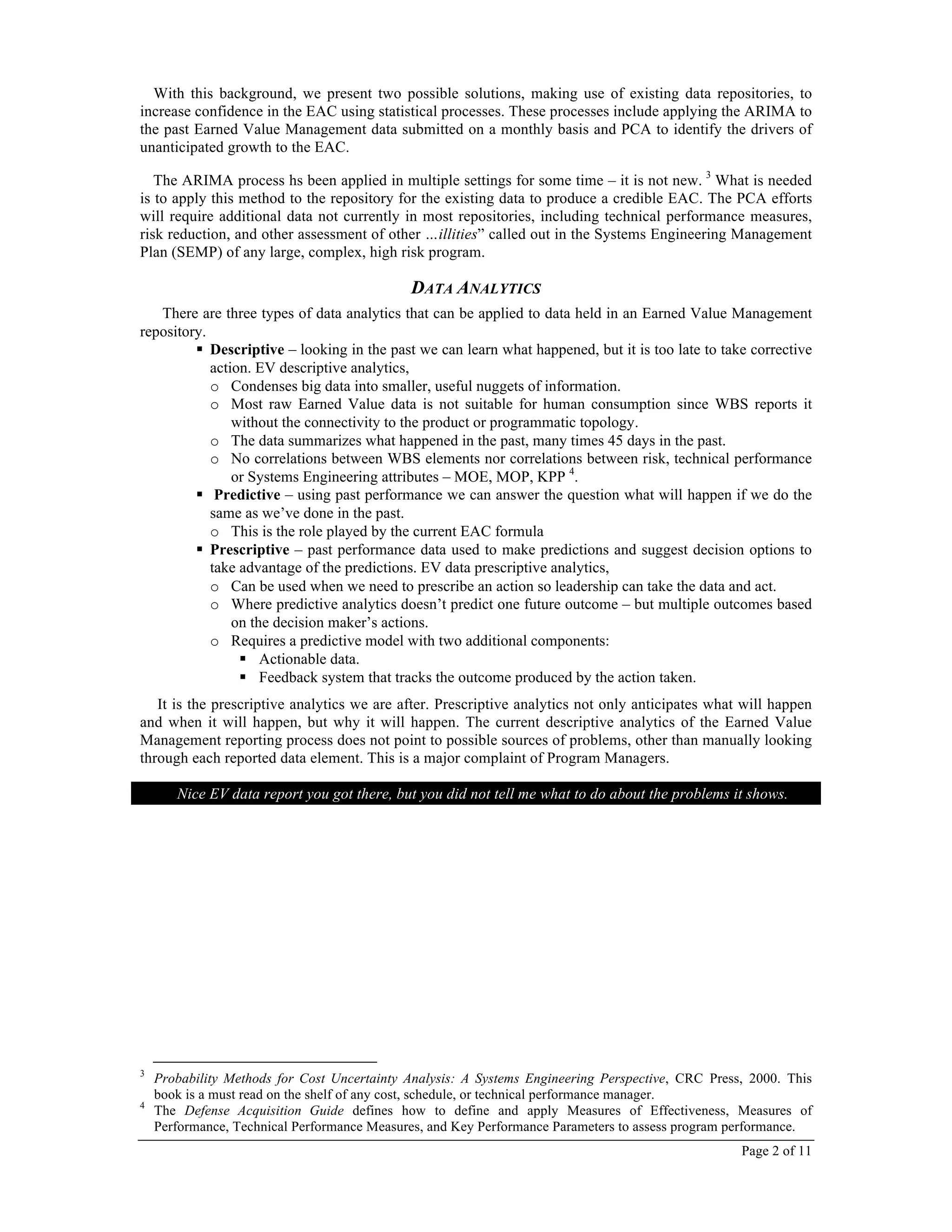 The document discusses the integration of Earned Value Management Systems (EVMS) with advanced statistical techniques and big data analytics, specifically using the Autoregressive Integrated Moving Average (ARIMA) algorithm to enhance estimates at completion (EAC). It criticizes traditional EVMS practices for their limitations, emphasizing the need to analyze past performance data to better forecast future outcomes and identify drivers of cost variances. The paper proposes a framework for applying statistical processes to the existing data in EVMS, ultimately aiming to improve decision-making and project performance tracking.
