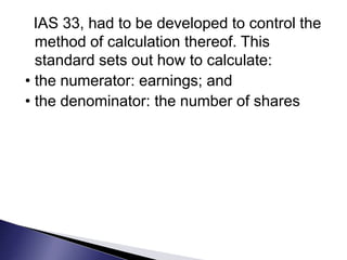 Earnings per share is a ratio used to analyze financial statements that measures a company's profit allocated to each outstanding share of common stock. International Accounting Standard 33 was developed to standardize how earnings per share is calculated, which involves dividing earnings attributable to ordinary shareholders by the weighted average number of ordinary shares. There are two types of earnings per share calculations: basic EPS uses actual ordinary shares outstanding, while diluted EPS considers additional potential ordinary shares, such as from convertible bonds, that would lower per-share earnings if converted.