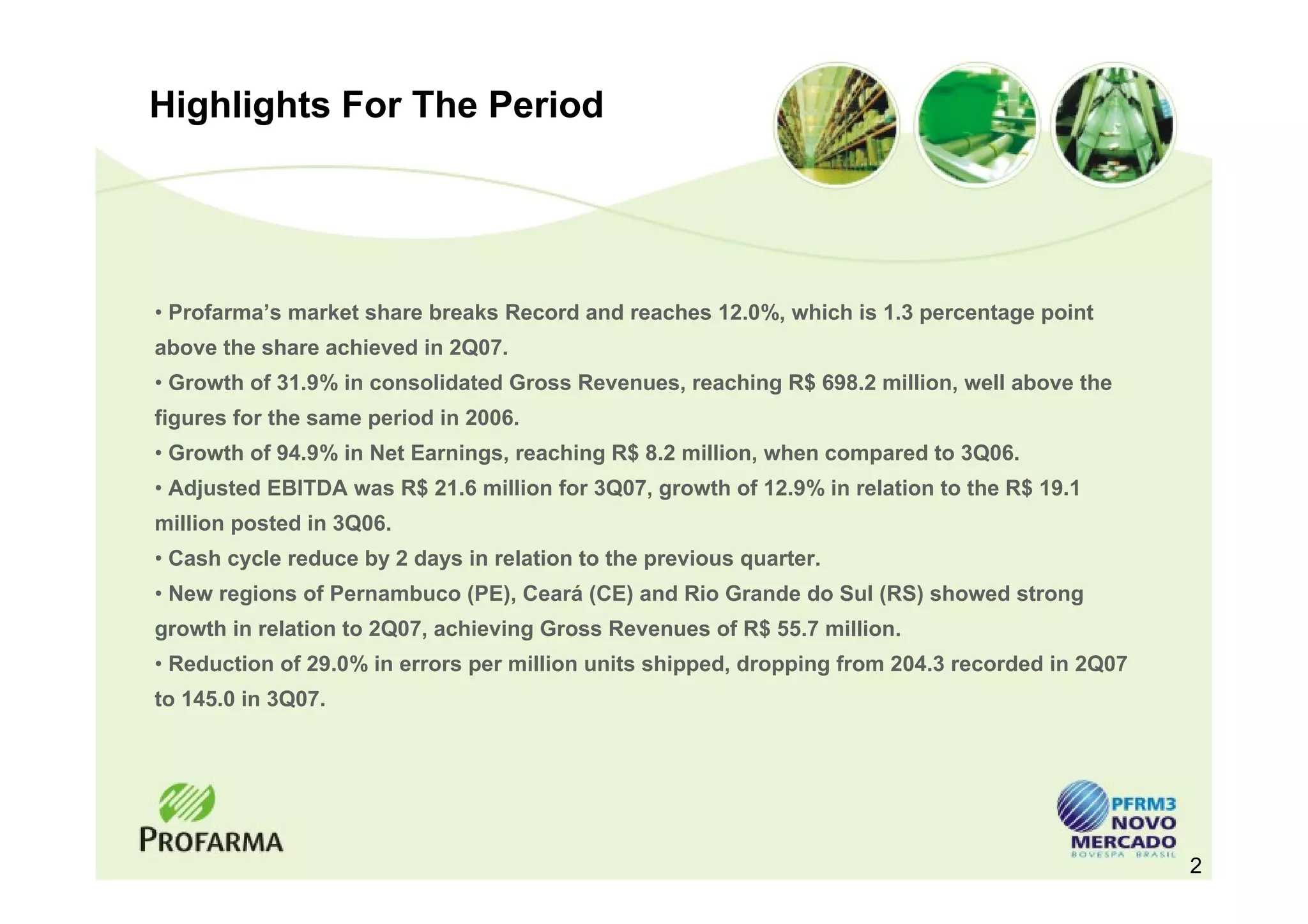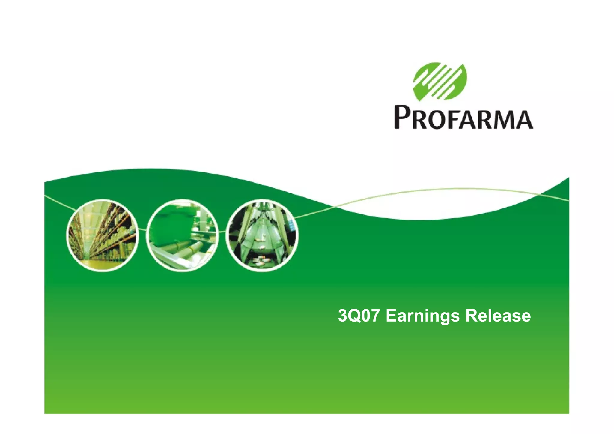 Profarma's market share reached a record 12.0% in 3Q07, with gross revenues growing 31.9% to R$698.2 million compared to 3Q06. Net earnings increased 94.9% to R$8.2 million due to strong sales growth across branded, generic, and OTC products. Adjusted EBITDA was R$21.6 million for 3Q07, a 12.9% increase over 3Q06, demonstrating improved profitability.