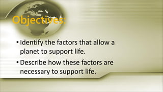 This document discusses factors that make Earth habitable and able to support life. It identifies five key factors: 1) Temperature - Life is supported within a limited temperature range on Earth's surface. 2) Water - Liquid water is essential for life processes. 3) Atmosphere - Earth's atmosphere provides insulation and protection from radiation. 4) Energy - A steady energy input, like from the sun, allows life's chemical reactions. 5) Nutrients - Earth's water cycle and volcanic activity replenish nutrients for organisms. The document examines what would happen without each factor and notes their importance in making Earth uniquely life-supporting in the solar system.