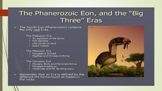 The document explains the geologic time scale, detailing the Earth's history through rock records that contain fossils. It describes the main eons, eras, periods, and epochs, along with the methods of relative and absolute dating used to establish this timeline. Significant events and life forms are highlighted from the Hadean eon to the Quaternary period, showcasing the evolution of life and major extinctions.