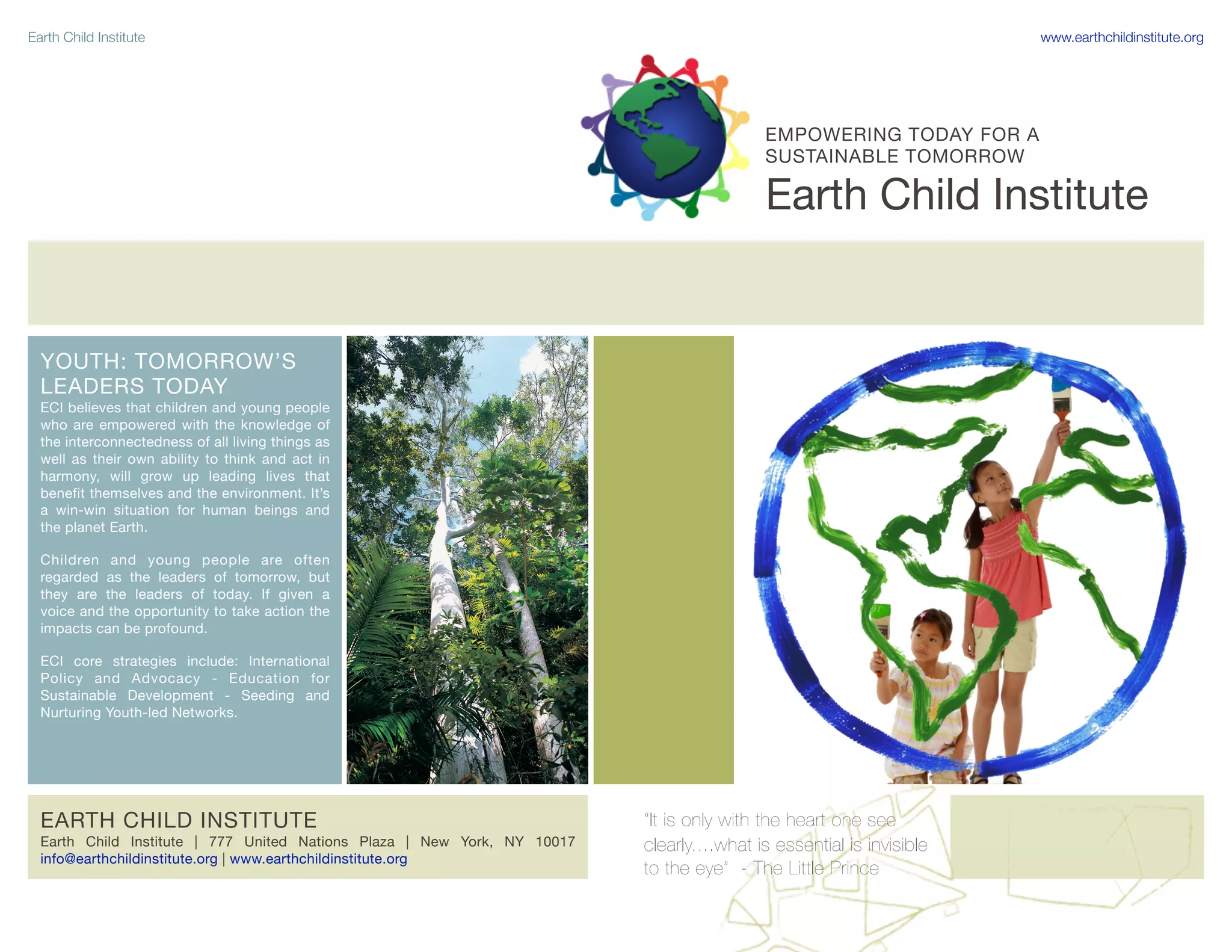 Earth Child Institute believes that empowering children and young people with knowledge about environmental interconnectedness and their ability to think and act harmoniously will lead to lives that benefit both people and the planet. The organization sees children and young people as leaders today, not just tomorrow, and that giving them a voice and opportunities to take action can have profound impacts. Earth Child Institute's core strategies include international policy and advocacy, education for sustainable development, and seeding and nurturing youth-led networks.