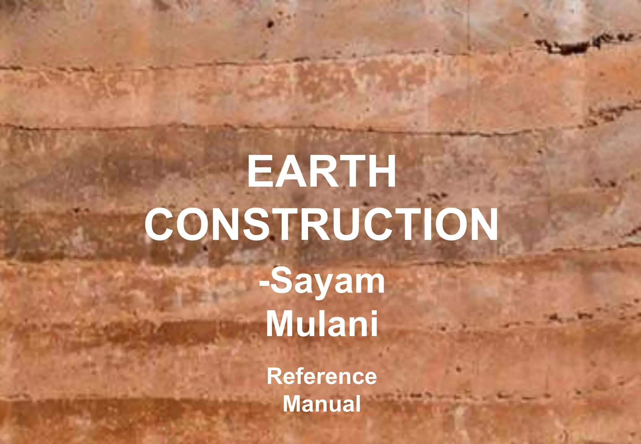 This document provides an overview of various earth construction techniques. It begins by explaining that earth structures are made primarily from soil and may include additives like straw or cement to add strength. Common earth building materials include mud, cob, adobe bricks, rammed earth, and compressed earth blocks.