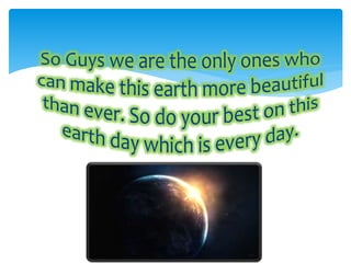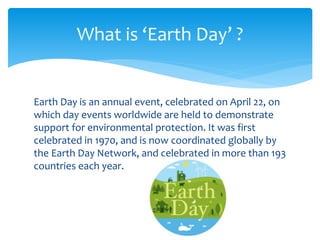 The document discusses Earth Day, which is celebrated annually on April 22nd. It originated in 1970 in the US as an environmental teach-in organized by Senator Gaylord Nelson in response to environmental damage. Earth Day now involves events worldwide to support environmental protection and is coordinated globally. The document provides background on Earth Day's origins and growth, as well as facts about annual celebrations and themes over the years focused on issues like climate change, sustainability, and tree planting.