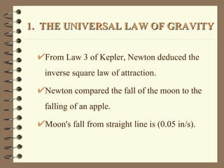 This document provides an overview of gravity and its effects. It discusses Newton's law of universal gravitation, how gravity decreases with distance, tides on Earth caused by the moon's gravity, gravitational fields, Einstein's theory of gravity warping space, and the properties of black holes. Key points include that gravity follows an inverse-square law, the moon causes two high and two low tides per day on Earth, and massive stars that shrink can become black holes with escape velocities greater than light speed.