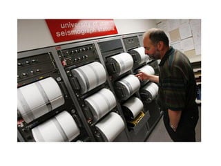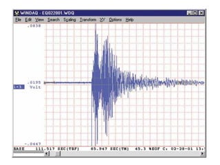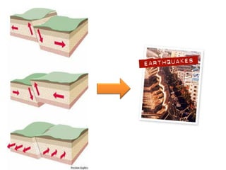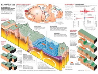 The document discusses earthquakes, including what causes them, how they are measured, their effects, and statistics on major earthquakes around the world. Specifically, it defines an earthquake as rapid shaking caused by the sudden release of energy along fault lines. It describes the movement of tectonic plates and how this results in earthquakes. Key points covered include earthquake magnitude scales, the different types of seismic waves generated, and data on some of the largest earthquakes by magnitude and their impacts.