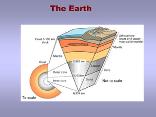 The document provides information about earthquake hazards and safety. It discusses the interior structure of the Earth including the crust, mantle, outer core, and inner core. It explains what causes earthquakes, noting they occur on faults when the blocks of rock on either side slip past one another. It emphasizes the importance of having an emergency plan and kit in case an earthquake occurs, including how to shut off gas, water, and electricity. Safety tips are provided about what to do during and after an earthquake.