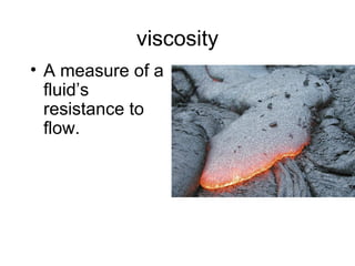 This document discusses different types of volcanoes and volcanic landforms. It describes shield volcanoes as having quiet eruptions of fluid basaltic lava, forming broad domes like the Hawaiian Islands. Cinder cones erupt gas-rich basaltic magma and have short lifespans of weeks to years. Composite cones have characteristics of both shield and cinder cones and can produce pyroclastic flows moving at speeds over 100 mph. Calderas are large depressions caused by the collapse of a volcano's top after eruption, often forming lakes. The type of volcanic eruption depends on factors like magma composition, temperature, and dissolved gas content. Other volcanic landforms include necks, pipes,