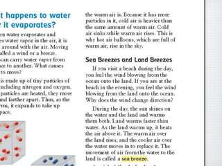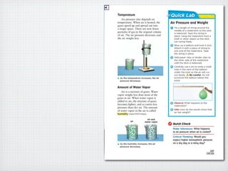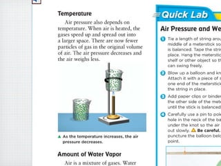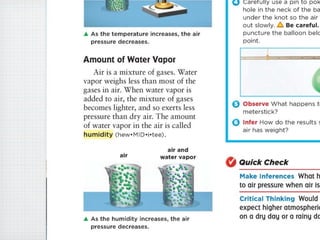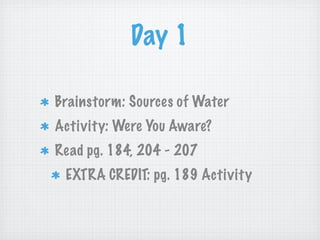 This document outlines a 20-day Earth science curriculum covering various topics like the water cycle, weather, climate, and the atmosphere. Some of the activities included are labeling a water cycle diagram, reading about air pressure and its effects, checking weather in different cities, learning about weather fronts, severe weather, climates, and the solar system. Students will complete worksheets, videos, readings, experiments, and a quiz to build their understanding of these Earth science concepts over the 20 days.