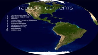 This document provides an overview of key concepts in earth science, including the layers of the Earth, different types of rocks (igneous, sedimentary, metamorphic), minerals, Moh's scale of hardness, properties of soil, weathering, erosion, deposition, volcanoes, earthquakes, and landslides/floods. It describes each layer of the Earth by depth and composition. It also defines the three main types of rocks, how each is formed, and provides examples. Additional topics like the rock and mineral identification and the geological processes of weathering and erosion are summarized as well.