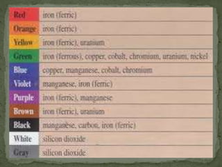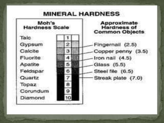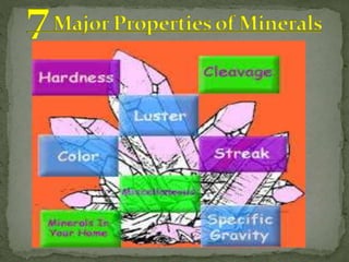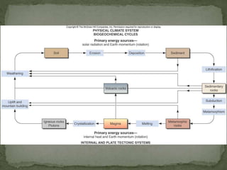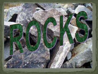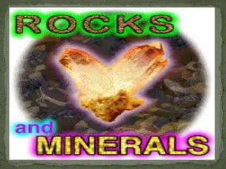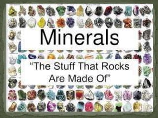 The document defines key terms related to minerals, rocks, and the rock cycle. Minerals are naturally occurring solid materials with a defined crystal structure and chemical composition. Rocks form from the solidification of magma or through the compaction and cementation of sediments. The rock cycle describes how rocks are continuously transformed between igneous, sedimentary, and metamorphic types through geological processes like crystallization, weathering, and tectonic activity.