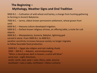 This document provides a history of meteorology and the invention of early weather instruments from 9000 BC to 400 AD. It describes how early civilizations like the Sumerians, Babylonians, Egyptians, Chinese and Greeks began making observations of the weather and climate and developing theories to explain atmospheric phenomena. Key figures mentioned include Thales of Miletus, Anaximander, Anaximenes, Empedocles, Aristotle, Theophrastus, who wrote one of the first weather forecasting manuals. It also outlines the development of early weather instruments like the barometer, thermometer, rain gauge and anemometer.