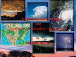 The document outlines the history of meteorology from its early beginnings in ancient civilizations, detailing the development of weather instruments and the evolution of weather understanding through various cultures from 9000 B.C. to the middle ages. Key contributions by figures such as Aristotle and Anaxagoras are highlighted along with the transition from mythological explanations to scientific observations. It also describes essential weather instruments like the barometer, thermometer, and anemometer and their functionalities.