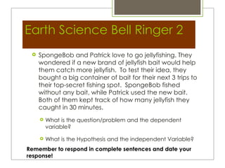 The document contains 4 sections of an Earth Science bell ringer activity. Section 1 asks which is the largest body of water on Earth and the percentage of the world's population living in the United States. Section 2 describes an experiment by SpongeBob and Patrick testing jellyfish bait and asks about the question, dependent variable, hypothesis, and independent variable. Section 3 instructs students to define independent variable, dependent variable, and control variables from their textbook. Section 4 asks what variables can be found in the purpose and hypothesis of an experiment and why control variables are important.