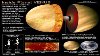 This document provides an overview of Earth science and the solar system. It describes the four branches of Earth science: geology, meteorology, astronomy, and oceanography. It then explains the importance of studying Earth science, including understanding natural resources and hazards. The document continues by defining the solar system and describing how it formed based on the planetesimal and nebular theories. It outlines the layers of the Sun and solar activities like sunspots and solar flares. Finally, it characterizes the eight major planets, grouping the inner terrestrial planets and outer gas giants, and provides key details about each planetary body.