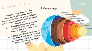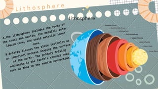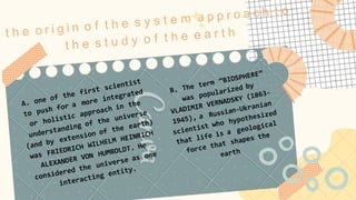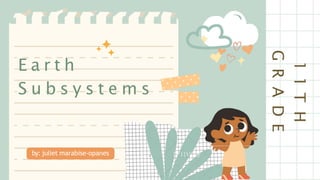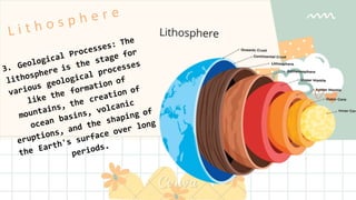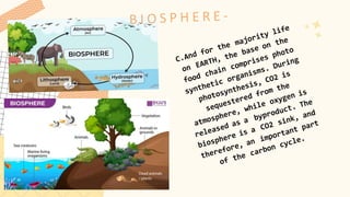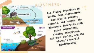The document summarizes key components of the Earth system including the atmosphere, hydrosphere, cryosphere, biosphere, and lithosphere. It provides details on: