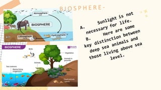 2) The hydrosphere, including that 70% of Earth is covered in ocean water, freshwater accounts for only 3% mostly as ice or groundwater, and the oceans absorb heat and CO2.