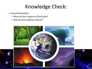 The document outlines an educational framework focused on Earth's subsystems, their interactions, and the field activities designed to enhance students' understanding of Earth system science. Students will explore Earth's four spheres through hands-on activities, including a transect walk and nature observations, fostering insight into the interconnectedness of these components. The lesson culminates in a presentation of a mind map depicting the relationships among the subsystems and their processes.