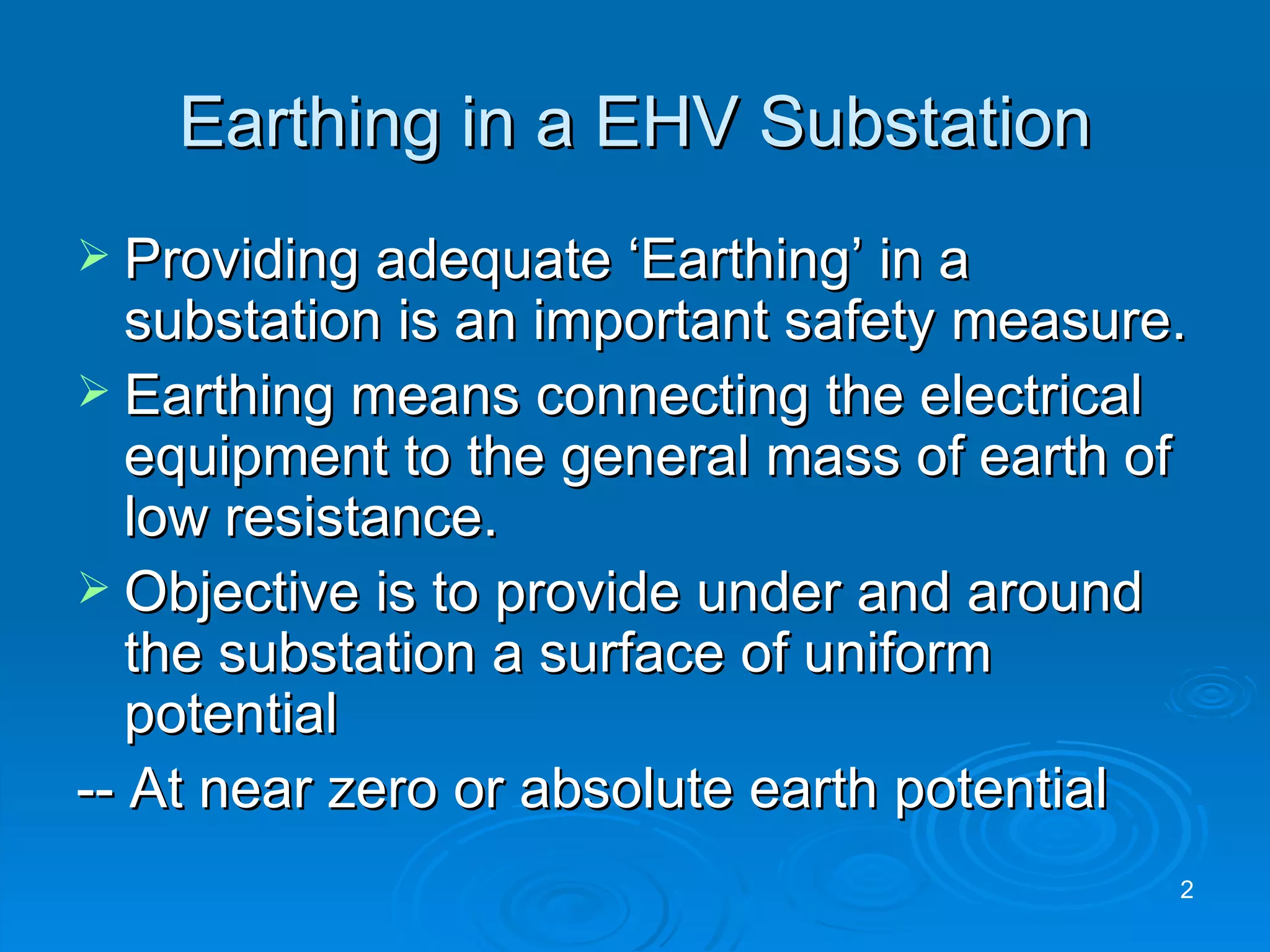 Earthing in a substation is important for safety. It involves connecting electrical equipment to earth at a uniform low potential to limit dangerous voltages under fault conditions. Key aspects of substation earthing design include soil resistivity testing, sizing the earth mat conductor based on fault current and duration, and ensuring step and touch potentials remain below safety limits. Proper earthing aims to provide protection to life and property against faults.