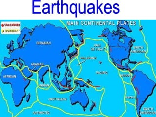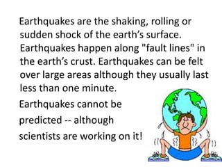 Earthquakes occur along fault lines in the earth's crust and cause shaking or sudden shocks of the earth's surface. They can be measured on the Richter scale, with those below 4.0 typically causing no damage and those over 5.0 capable of causing damage. Earthquake waves called seismic waves travel outward from the epicenter in three main types - P waves that travel fastest, S waves that are slower, and surface L waves that are slowest but can cause the most damage.