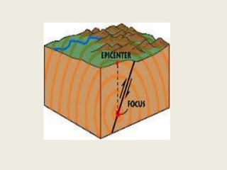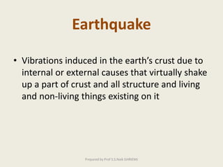 The document discusses earthquakes, including defining them as vibrations induced in the earth's crust due to internal or external causes. It describes seismology as the science dealing with studying earthquakes. Key terms are defined, such as the focus or hypocenter being the point of origin below the surface, and the epicenter being the point above the focus. Different types of seismic waves - P, S, and L waves - are described. Earthquakes are classified based on depth, magnitude using the Richter scale, and causes. Causes include tectonic plate movements and volcanic eruptions. Effects are shaking, landslides, fires, tsunamis, and impact on humans, rivers and seas. Design of earthquake