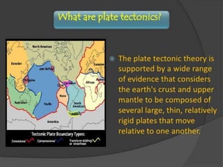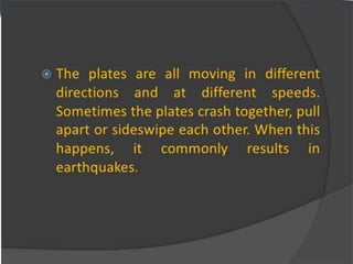 Earthquakes are caused by the movement of tectonic plates underneath the Earth's surface. When the plates shift with great force, they release stress and energy in the form of seismic waves that cause the shaking we feel. To prepare for earthquakes, structures should be evaluated for safety and retrofitted if needed. During shaking, people inside should duck and cover underneath sturdy furniture, while those outside should move to an open area away from buildings and power lines. Aftershaking stops, evacuation should be orderly and help given to others to reduce casualties from potential damage or aftershocks. Earthquake drills help practice safe response procedures.