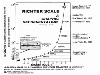 - The Richter scale measures an earthquake's magnitude - larger quakes over 8.0 occur about once per year globally.