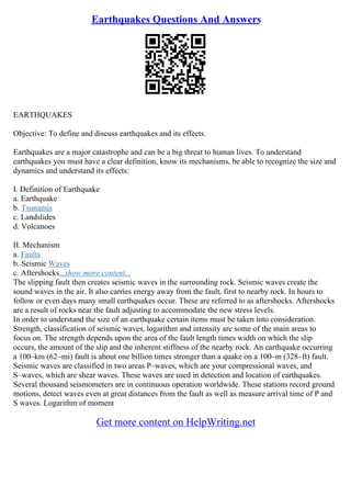 The document discusses the definition, mechanisms, types, and effects of earthquakes, emphasizing their catastrophic potential on human lives and infrastructure. It outlines the causes of earthquakes, including tectonic activities and human-induced factors, and highlights the importance of awareness and preparedness. The economic and social impacts of earthquakes are detailed, along with historical examples of significant earthquakes and their aftermath.