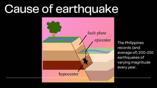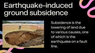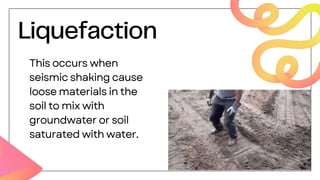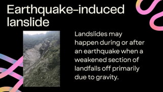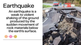 This document discusses earthquake hazards, including potential hazards, early warning signs, how to interpret hazard maps, and precautionary and safety measures before, during, and after an earthquake. It outlines how to identify earthquake hazards in an area, what signs may indicate an earthquake is coming, how to understand hazard maps, and specific safety steps to take both before and after an earthquake occurs.