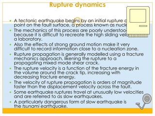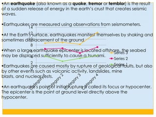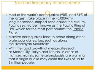 Most earthquakes occur along fault lines in the earth's crust due to the buildup and sudden release of strain energy. There are approximately 500,000 earthquakes detected around the world each year, with about 100,000 able to be felt. Major quakes of magnitude 7.0 or greater occur on average 18 times per year. The circum-Pacific seismic belt sees 90% of the world's quakes due to tectonic plate movement. Human activities such as dam building and fluid injection can also induce seismic activity in rare cases.