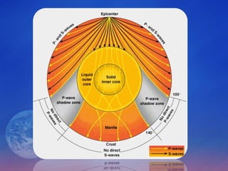 Scientists determine the composition of Earth's interior layers by measuring seismic waves from earthquakes. The speed and ability of different types of waves to travel through solids and liquids provides information about what materials exist in Earth's core and where transitions between layers occur. Earth has a solid inner core of iron and nickel surrounded by a liquid outer core, with a mantle divided into lithosphere and asthenosphere, and an outer crust made of oceanic or continental plates.