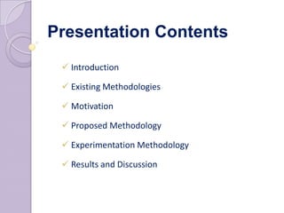 This document presents a proposed methodology for earthquake detection using analysis of seismic signals. It begins with background on earthquakes and existing detection methods. The proposed method involves analyzing seismic signals using wavelet transforms to extract energy and frequency parameters. These parameters are then used to calculate magnitude, wavelength, and rupture area. The methodology is tested on real seismic datasets containing over 10,000 signals. Results show the method can accurately detect earthquakes with magnitudes above 4.0 based on analyzing the extracted energy and frequency characteristics.