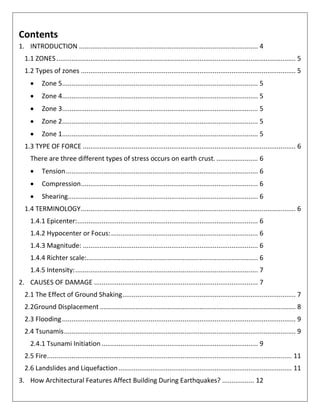 The document provides an extensive overview of earthquakes, including their causes, effects, and how architectural features influence the performance of buildings during seismic events. It discusses different seismic zones in India, types of forces acting on the earth's crust, and various hazards associated with earthquakes such as ground shaking, tsunamis, flooding, and fire. Recommendations for constructing earthquake-resistant buildings are also highlighted, emphasizing the importance of building design and materials to enhance safety and minimize damage.