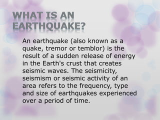 An earthquake is a sudden release of energy in the Earth's crust, resulting in seismic waves that cause ground shaking and potential displacement. They are primarily caused by the rupture of geological faults, with additional triggers including volcanic activity and landslides. Earthquakes can occur at convergent, divergent, or transform plate boundaries, where tectonic plates interact, often leading to significant geological events.