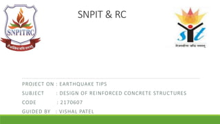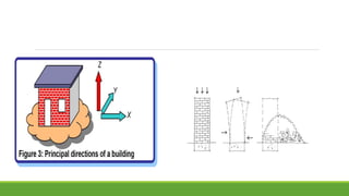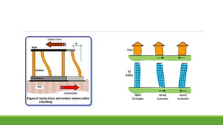 This document discusses the effects of earthquakes on reinforced concrete structures and important architectural design considerations. It covers 4 main seismic effects: 1) inertia forces in structures, 2) deformations in structures, 3) horizontal and vertical shaking, and 4) flow of inertia forces to foundations. It then discusses 4 key architectural features that affect earthquake performance: 1) size of buildings, 2) horizontal layout, 3) vertical layout, and 4) adjacency of buildings. Specific configurations that perform poorly, like tall slender buildings, buildings with re-entrant corners, or buildings with vertical setbacks or soft stories, are highlighted. The document emphasizes the importance of coordination between architects and engineers to design seismically resistant buildings.