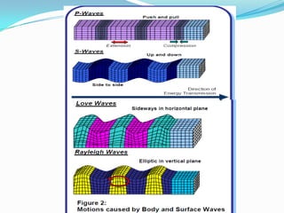 1) Seismic waves generated by earthquakes travel through the Earth's layers as body waves and surface waves. Body waves include P-waves and S-waves, while surface waves include Love waves and Rayleigh waves.