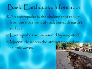 The document summarizes information about earthquakes, including how they are caused by movement of rock beneath the earth's surface. It describes the different types of seismic waves produced by earthquakes and discusses the major 2011 Tohoku earthquake in Japan. This earthquake, measured at magnitude 9.0, caused widespread damage through tsunamis, landslides and collapsed buildings. It severely impacted the Japanese economy by damaging factories and disrupting the auto industry, and also caused problems for nearby nuclear power plants.