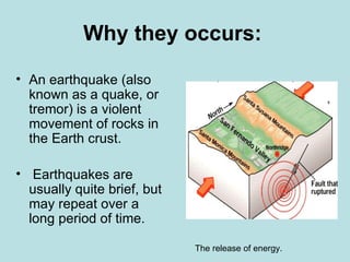 Earthquakes are caused by the release of energy in the Earth's crust due to movements of tectonic plates. The main types of fault that cause earthquakes are normal, reverse thrust, and strike-slip. Earthquakes produce seismic waves that damage buildings and infrastructure, endangering human life. They can also trigger tsunamis, which are large ocean waves that inundate coastal areas. Scientists are still working on predicting earthquakes, but earthquake-proofing of buildings has helped reduce risks in places like Japan and California that experience frequent seismic activity.