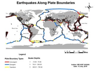 Earthquakes occur along fault lines as a result of tectonic plate movement and built up stress being released. They can cause significant damage depending on their magnitude, proximity to populated areas, and local soil and construction practices. Major earthquake zones exist along plate boundaries where tectonic plates converge, diverge, or move past each other. The largest, most destructive quakes occur in subduction zones. To minimize earthquake risk, communities can educate citizens, construct earthquake-resistant buildings, and implement emergency planning and insurance.