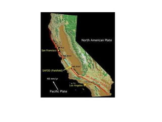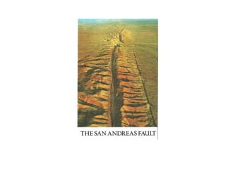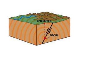 An earthquake is caused by the sudden movement of parts of the Earth's crust and results in shaking and trembling of the ground. There are over one million earthquakes each year, with around twenty having the potential to cause severe damage. Earthquakes are caused by faults in the Earth's crust, such as the San Andreas Fault in California where the land west of the fault moves north and the land east moves south. Underwater earthquakes can generate destructive tsunamis. The focus is the depth below the surface where the earthquake occurs, and the epicenter is directly above on the surface. Seismographs detect seismic waves that travel out from the epicenter, including fast P waves and slower S waves.