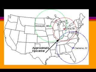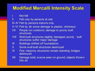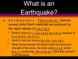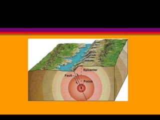 Earthquakes occur when energy stored in Earth's crust is suddenly released, causing seismic waves. The focus is where the seismic waves originate underground, and the epicenter is the point directly above on the surface. There are three main types of seismic waves - P waves, S waves, and L waves - which travel outward from the focus. Earthquakes are measured by their magnitude, which indicates the amount of energy released, and by their intensity, which describes the observed effects on people and structures.