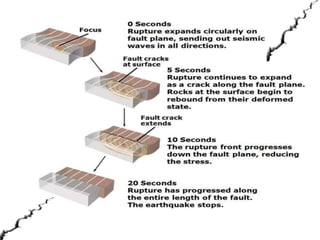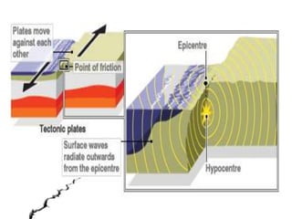 The document discusses the causes and effects of earthquakes. It explains that earthquakes are caused by a sudden release of energy in the Earth's crust that creates seismic waves. Major effects of earthquakes include shaking and ground ruptures that can damage buildings, landslides and avalanches, fires caused by damage to power lines or gas lines, and tsunamis generated by undersea earthquakes or landslides. While fully predicting earthquakes is not yet possible, the probability of fault movement can be estimated, and some earthquake warning systems can now provide regional alerts before shaking occurs.