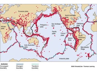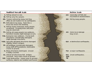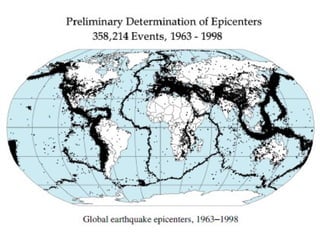 The document provides information about earthquakes, including what causes them, how they are measured, different types of seismic waves, damage from earthquakes, and safety tips. Specifically, it explains that earthquakes are caused by the sudden release of energy at fault lines in the earth's crust. They can be measured using seismographs which record the amplitude and duration of seismic waves. Safety advice includes having an emergency plan and supplies like food, water, and first aid ready both during and after an earthquake.