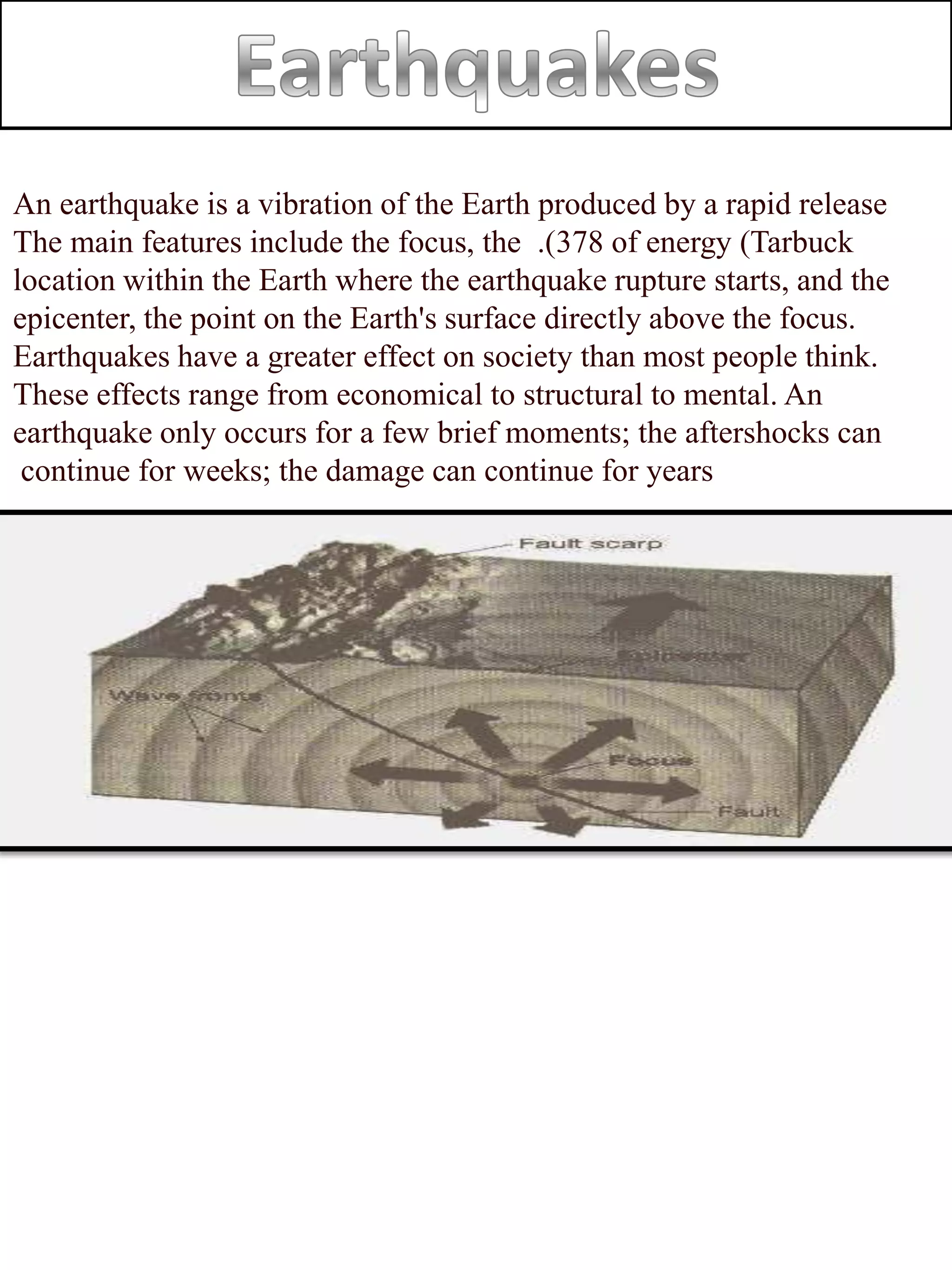 An earthquake is caused by a sudden release of energy at a focus within the Earth. There are two main types of seismic waves generated: P-waves and S-waves. P-waves travel faster and arrive first, while S-waves oscillate perpendicular to their direction of travel. Surface waves travel along the Earth's surface and can cause significant damage to structures and utilities. Earthquake location can be estimated through triangulation using travel time differences of seismic waves recorded by multiple stations. Earthquake strength is measured by both the Richter scale based on amplitude of seismic waves, and the Modified Mercalli scale based on extent of damage observed.
