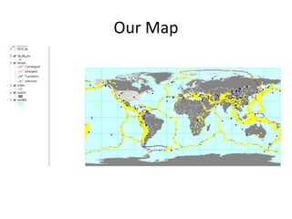 The document discusses factors that influence earthquake prediction such as foreshocks and aftershocks. It also notes that major earthquakes commonly strike along convergent plate boundaries, such as in Chile. The document evaluates different regions around the world in terms of their recent seismic activity and likelihood of future quakes. Mongolia is identified as an area that could experience a major earthquake soon due to the number of recent small foreshocks.