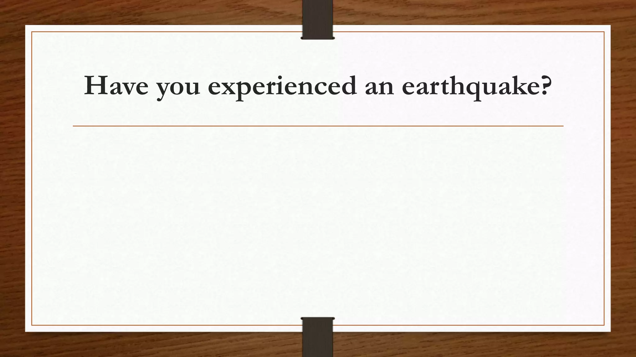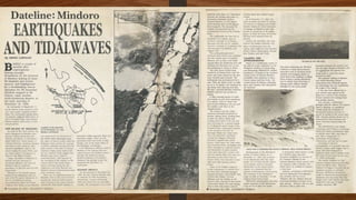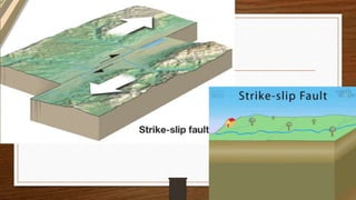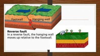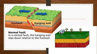 The document defines earthquakes as the sudden, violent shifting of massive plates underneath Earth's surface that causes wave energy to transmit through bedrock. It identifies the key parts of an earthquake as the focus, epicenter, fault, and fault line. It explains that active faults have recent movement recorded, while inactive faults have no recent or expected future movement. The document also describes the three main types of faults: normal faults where the hanging wall moves down, reverse faults where it moves up, and strike-slip faults where blocks slide past each other horizontally.