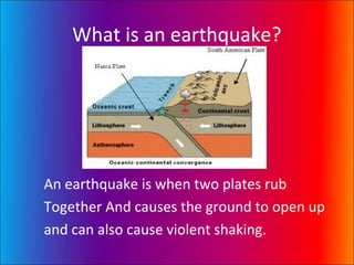 An earthquake occurs when tectonic plates rub together, causing the ground to open up and shake violently. New Zealand holds earthquake drills called "shake outs" so residents know how to respond when an earthquake strikes - they should drop to the ground, take cover under sturdy furniture, and hold on. The drills help prepare people to stay safe whether they experience an earthquake at home, work, or school.