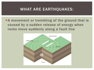 This document defines key terms related to earthquakes and seismic waves. It explains that earthquakes are caused by a sudden release of energy along fault lines in the earth. The focus is the location within the earth where the earthquake starts, while the epicenter is the point on the surface directly above the focus. There are three main types of seismic waves: P-waves which move in the direction of travel, S-waves which move sideways, and surface waves which cause the most damage. The timing and speed of P and S waves detected by seismic stations can be used to locate the epicenter of an earthquake.