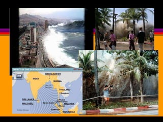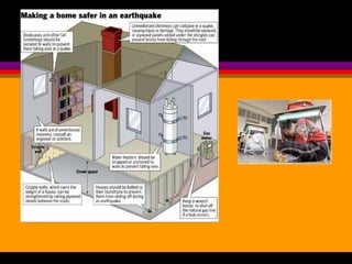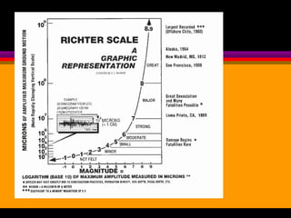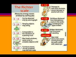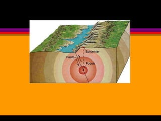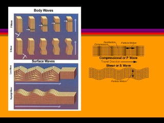 Earthquakes are caused by the sudden release of built-up energy along fault lines in the Earth's crust. When the stresses exceed the strength of the rocks, they break and seismic waves are produced. There are three main types of seismic waves - P waves, S waves, and L waves. P waves travel fastest while L waves cause the most damage. Earthquakes are measured by both magnitude, which indicates the amount of energy released, and intensity, which describes the effects at a particular location. Analyzing seismic wave arrival times at multiple stations allows scientists to determine the epicenter and focus of an earthquake. Major earthquake hazards include tsunamis, landslides, liquefaction, and falling debris.