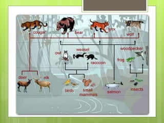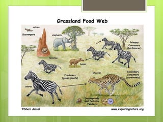 The document discusses different biomes including deserts, grasslands, and forests. It provides details on the key characteristics of each biome such as average temperature, precipitation levels, dominant vegetation, and common animal life. For deserts, the main points are that precipitation is low, evaporation exceeds rainfall, and vegetation is light. Grasslands are defined as having enough rainfall for grass growth and preventing permanent forests. Forests are described as having a variety of plant and tree life that provide habitat for many animal species.